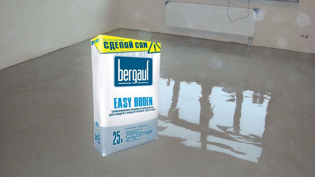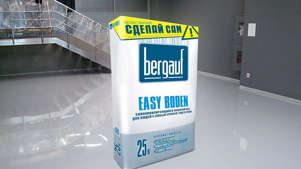 «Бергауф Easy Boden самонивелирующийся» наносится слоем 6-50 мм. Время работы с разведенной смесью 30 минут. Ходить по поверхности можно через 4-8 часов после нанесения.
