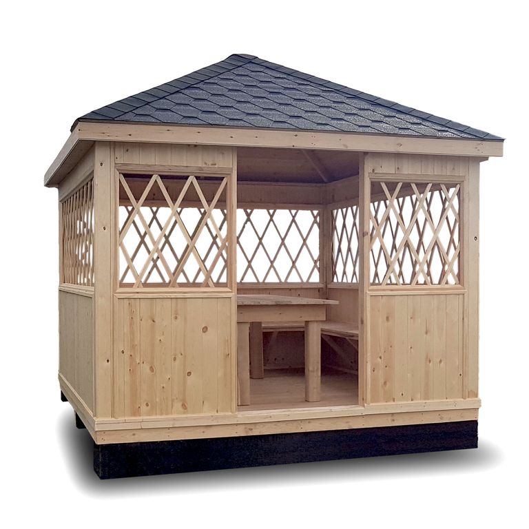 Дачная беседка имеет четырехскатную шатровую кровлю. Ваш загородный участок преобразится благодаря четырехгранной форме и компактным размерам беседки.