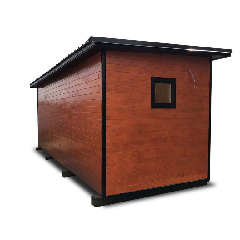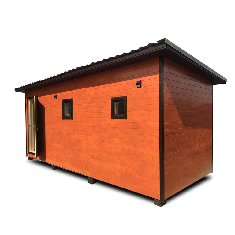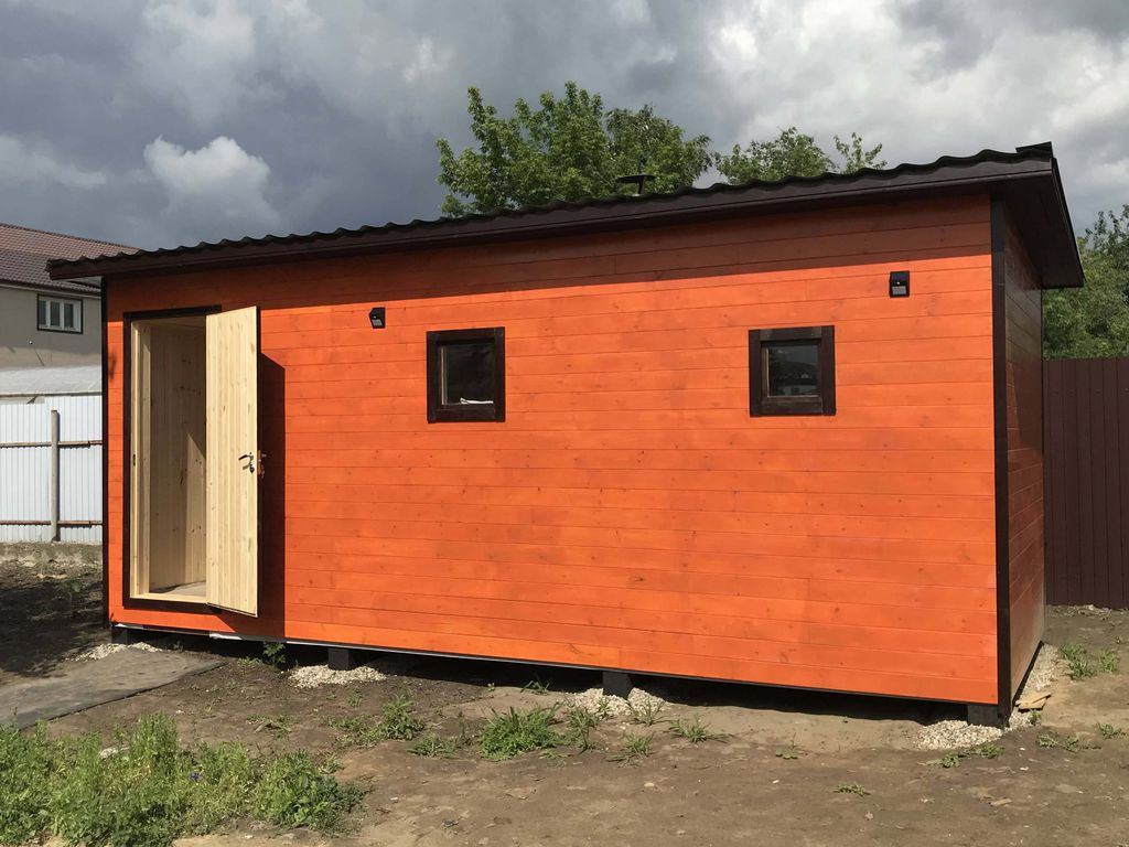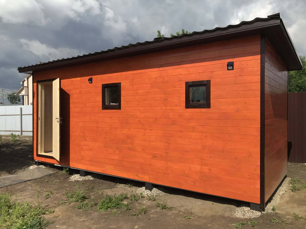 Обвязка выполнена из лиственничного бруса, это нужно для надежной транспортировки, и чтобы полы не начали гнить. Весь каркас обязательно обрабатывается огнебиозащитой. Вагонка покрывается защитно-тонирующим составом, что также является антисептиком.