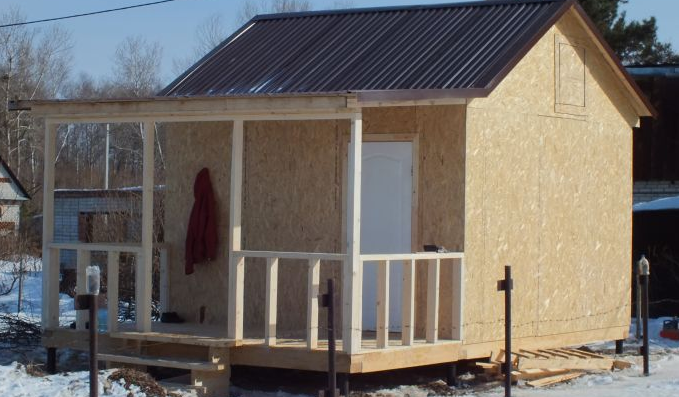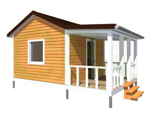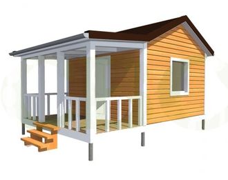 Небольшой каркасный дом 6х4 (Общая площадь 24 м2), одноэтажный, высота потолков 2 метра, с открытой верандой. Отлично подойдет для тех, кто хочет иметь красивый домик на участке, но при этом сэкономить бюджет.