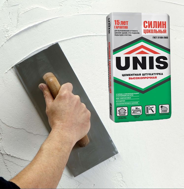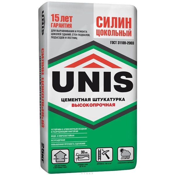 «Штукатурка Юнис Силин Цокольный цементная упрочненная 25 кг» — это быстро засыхающая смесь для нанесения высококачественного отделочного слоя. Используется для выравнивания поверхностей цоколей зданий, наружных подъездов, лестниц. Еще используются как в сухих, так и с повышенной влажностью помещениях, а также в помещениях без отопления.
